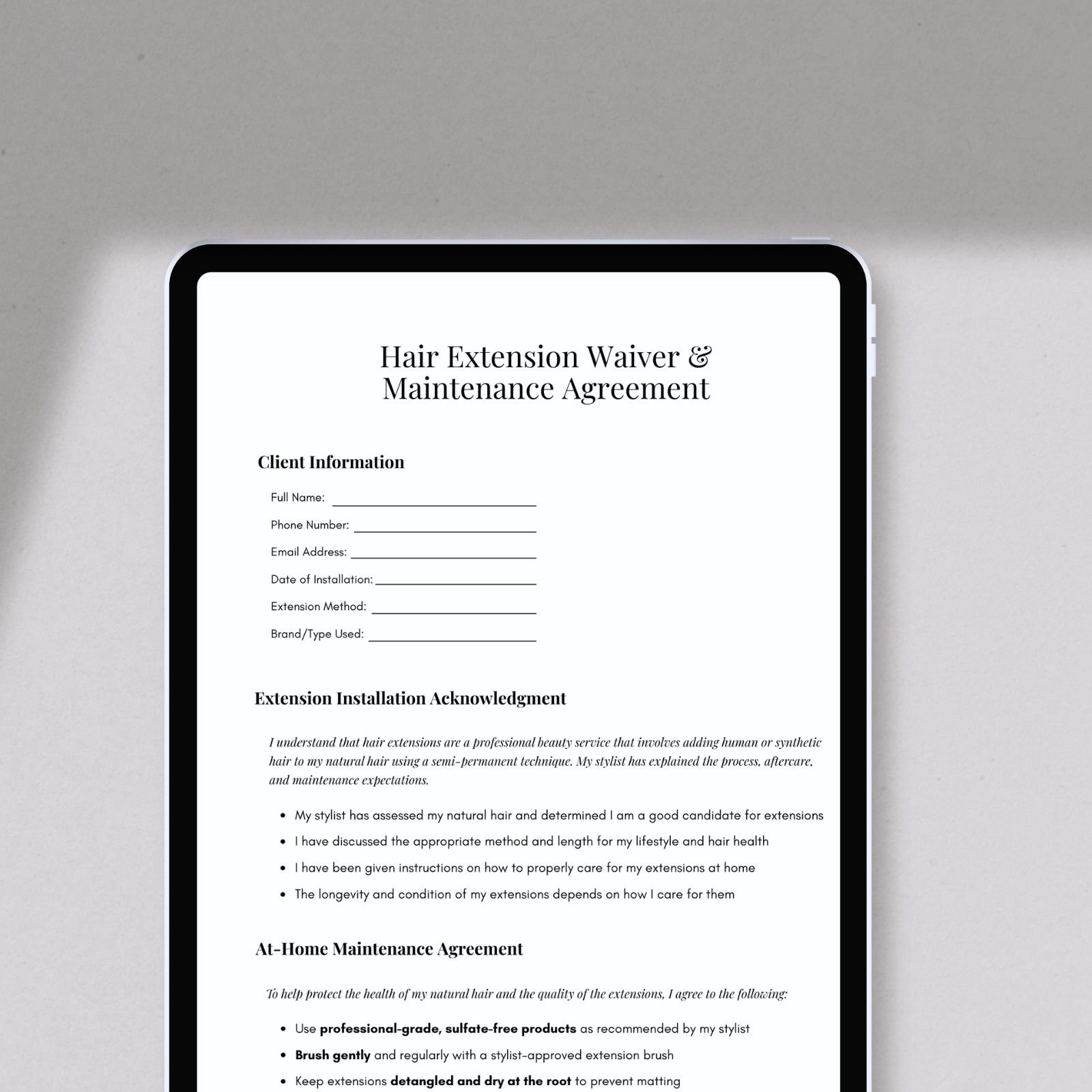 Salon owners, extension specialists, independent stylists, suite owners, and educators who want clear, professional client agreements.